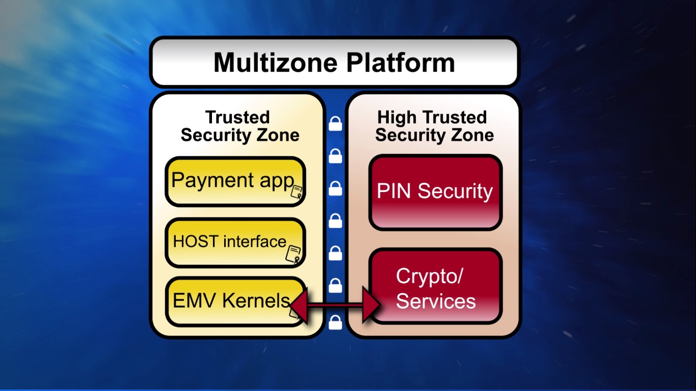 Эта безопасная среда поддерживает множество функций, позволяющих осуществлять безопасные платежи с использованием новейших технологий. Используя наши возможности в обеспечении безопасности для всех видов платежных систем, эта новая архитектура облегчит соответствие PCI и EMV в решениях для контактных и бесконтактных платежей.