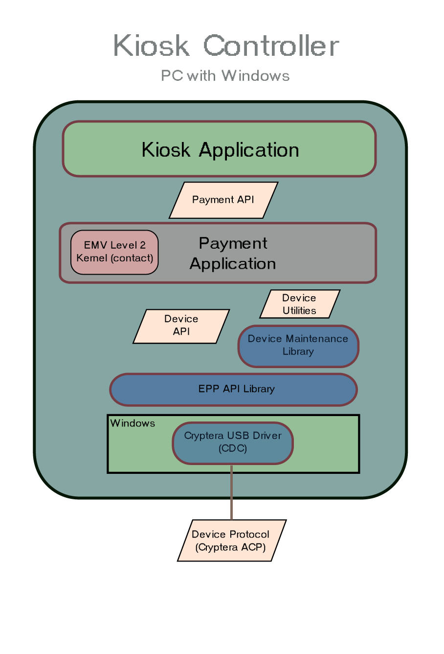 Чтобы упростить интеграцию программного обеспечения в Windows, Cryptera предоставляет Windows Dynamic Link Library (dll), которая реализует протокол. Основное приложение может использовать эту библиотеку для настройки связи с устройством Cryptera. Также приведен простой пример, показывающий, как загружать и использовать библиотеку.